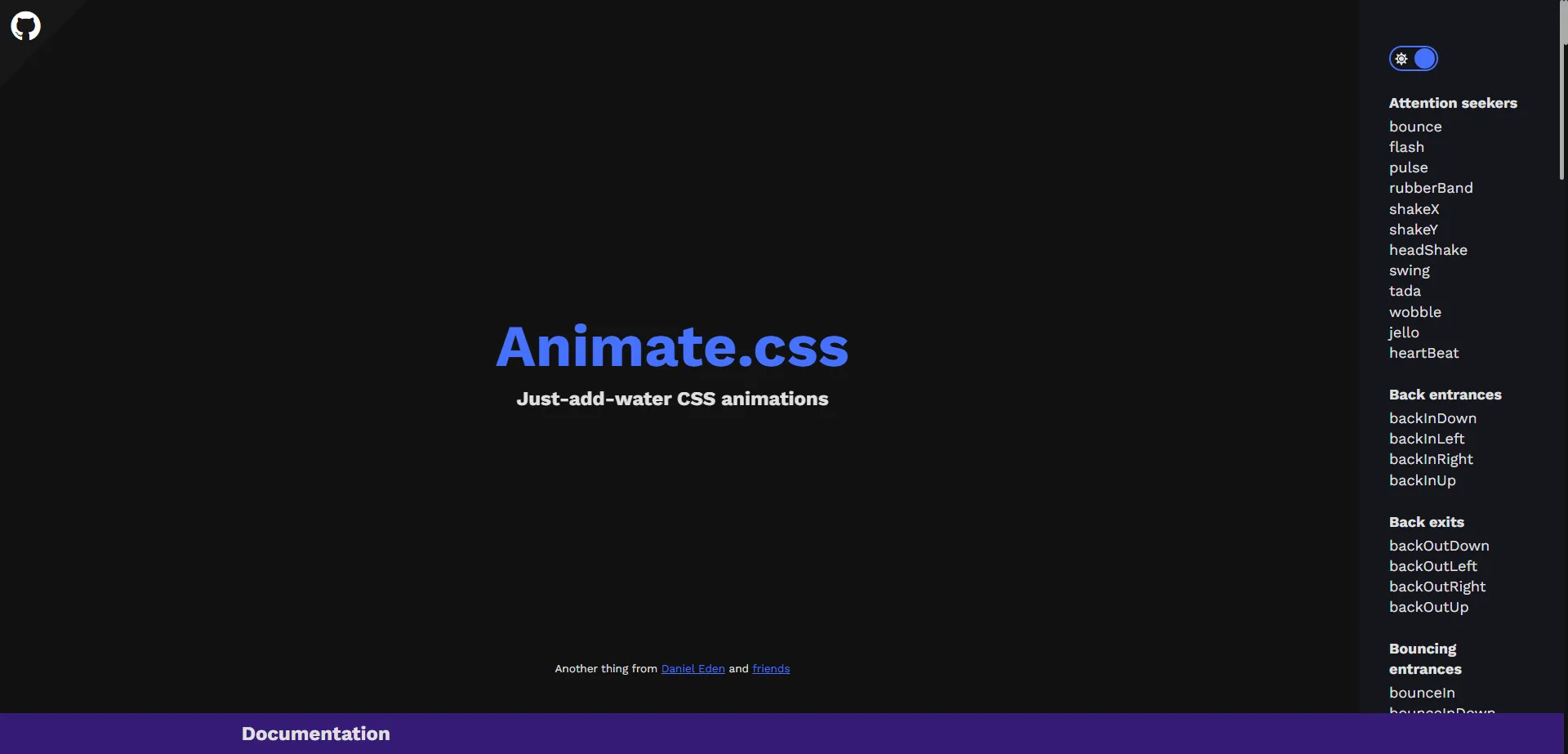 Animate.css准确来说是一个集成了许多丰富过渡动画css的组件库,引入后为元素指定class即可完成对元素的入场、出场或其他状态下的动画。官方文档